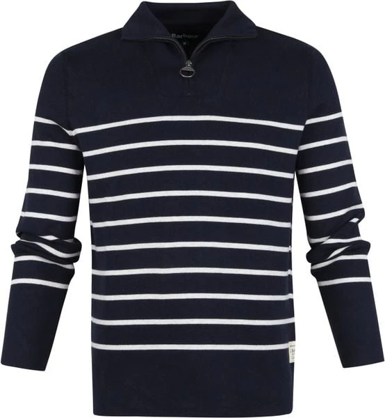 De stijlvolle trui heeft een modische donkerblauwe kleur en is voorzien van een strepen dessin, wat voor een moderne en casual touch zorgt. Daarnaast is de herentrui afgewerkt met een ritssluiting. De Regular-Fit pasvorm valt ruim om je bovenlichaam en zorgt zo voor zowel voldoende bewegingsvrijheid als een verzorgde uitstraling. Hierdoor is de Barbour trui erg geschikt om over bijvoorbeeld een overhemd of T-shirt te dragen.